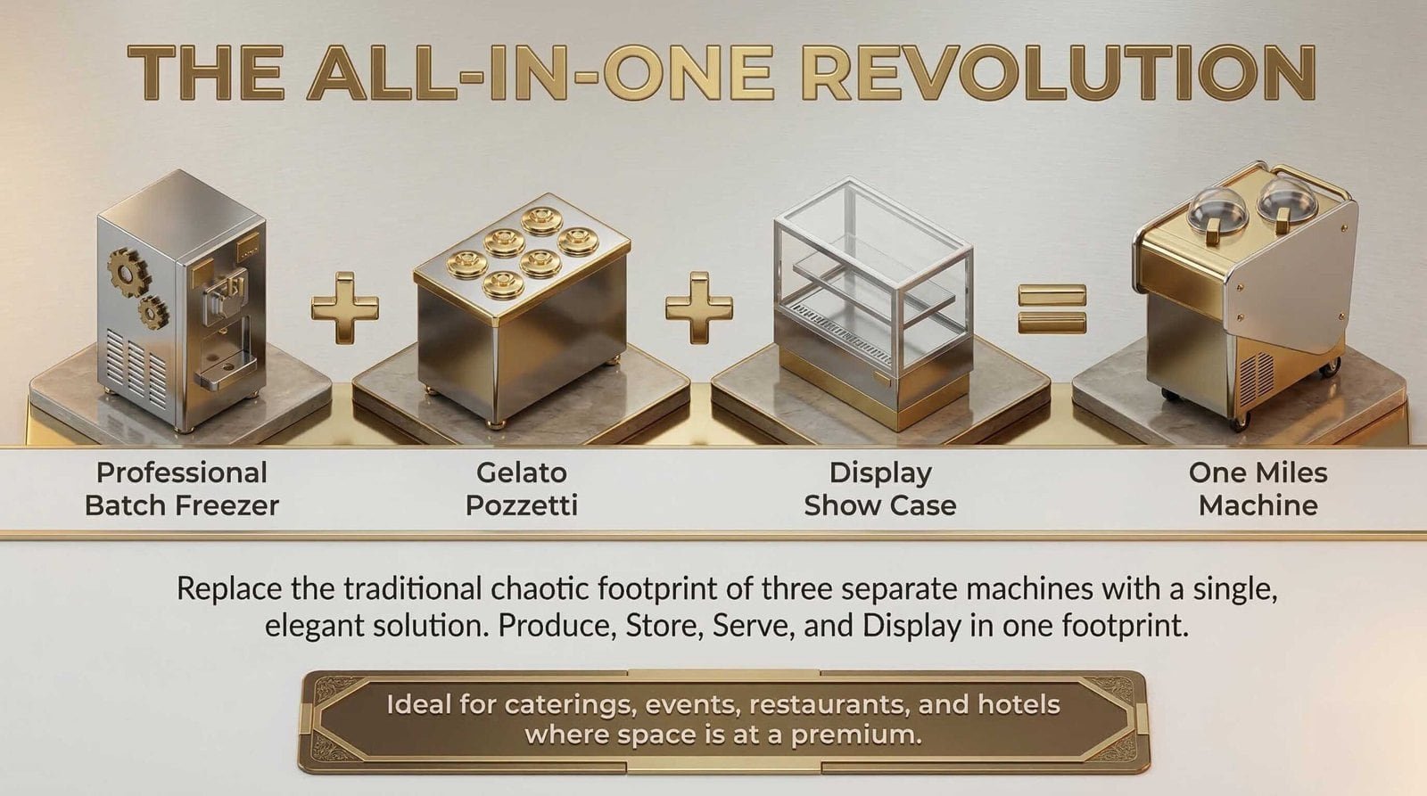 A classic gelato operation often needs too much equipment, too much space, and too much back-of-house handling.