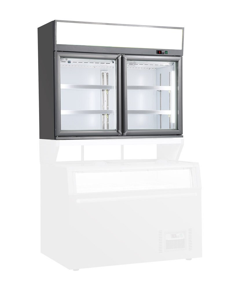 This model features a sliding glass opening system (Manhattan) for easy access, combined with hot-gas automatic defrost for low maintenance. With a temperature range of -22 °C to -18 °C, it ensures reliable storage of frozen products.