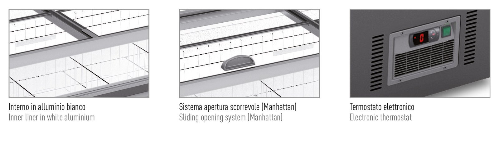 This model features a sliding glass opening system (Manhattan) for convenient access, combined with hot-gas automatic defrost for easy maintenance. With a temperature range of -22 °C to -18 °C, the ALASKA TOP 210 ensures consistent freezing performance while providing excellent product visibility with 3 integrated LED lights.
