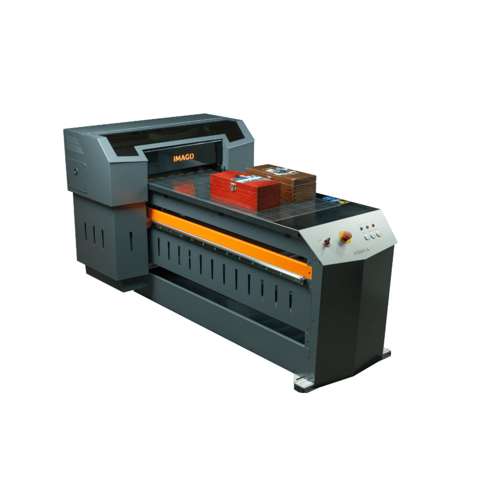 AQUILA UV LED – Polish small-format UV LED printer Eliminate the need for external contractors and take full control of your business with the small-format UV LED printer from IMAGO. The device is ideal for companies that want to start their own production of branded products. At the same time, companies focused on large-scale production will gain the ability to fulfill individual orders and offer personalization. White ink recirculation and mixing system These are our proprietary solutions that prevent white ink from drying out in bottles and hoses. In addition, the standby mode allows the printers to remain fully operational during long downtimes with very low energy consumption. Systems that increase the life of the printing system. The dust extraction system used in our UV LED printer allows you to print on uneven surfaces and dusty materials without worrying about the condition of the printing system. In addition, the black work table prevents ink particles from hardening on the print head. Properly selected UV LED lamp The air-cooled UV LED lamp used in the device is maintenance-free and does not require your attention during operation. The appropriate power setting of the UV LED lamp allows printing on heat-sensitive products without the risk of product deformation. Small UV LED printer for personalization The small format is a convenient solution that will work well in the advertising, tourism, and wedding industries, as well as in printing houses. In addition, the table with a ruler and matching dies ensure easy positioning of small products. Signaling systems and intuitive service mode The systems used in the machine allow for easy operation of the device. Signaling systems will inform you when it is necessary to refill the ink or empty the consumable tank. Aquila UV LED will also inform you when printing is complete.
