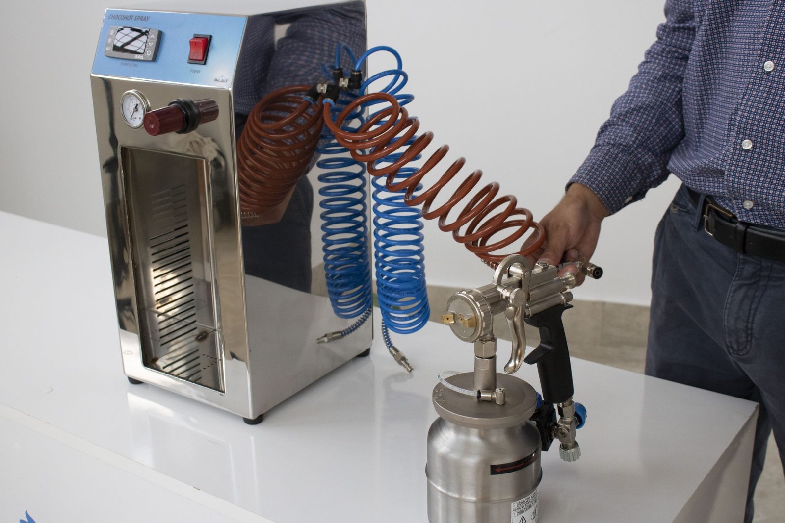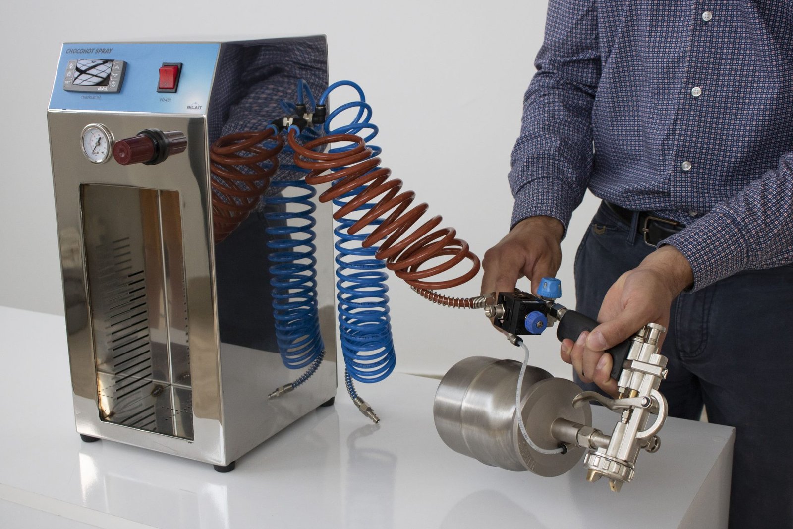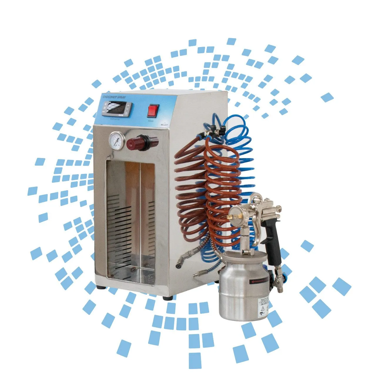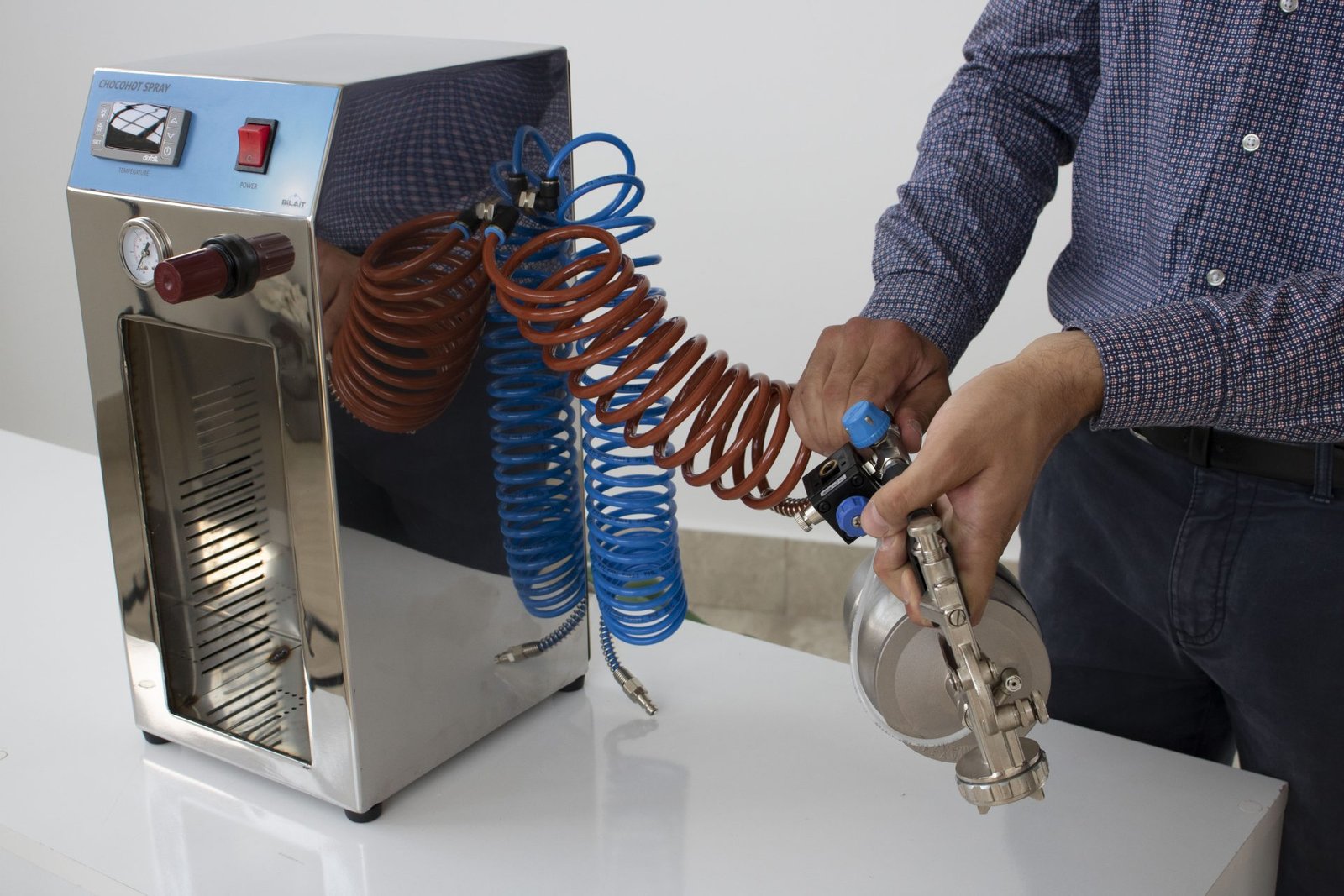 Single-tank spraying machine for chocolate and cocoa butter. Perfect for applying a smooth, decorative coating on cakes, pastries, pralines or semifreddo. Fast, precise and hygienic — an essential tool for professional chocolatiers and pastry chefs.