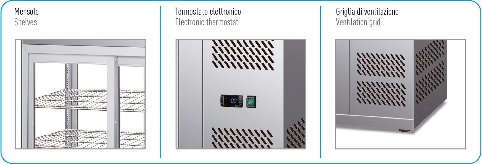 Built with stainless steel construction, an electronic thermostat, and a self-closing glass door, the CKC 100 offers both durability and convenience. Its compact countertop design makes it an ideal choice for businesses with limited space, without compromising storage capacity or performance.