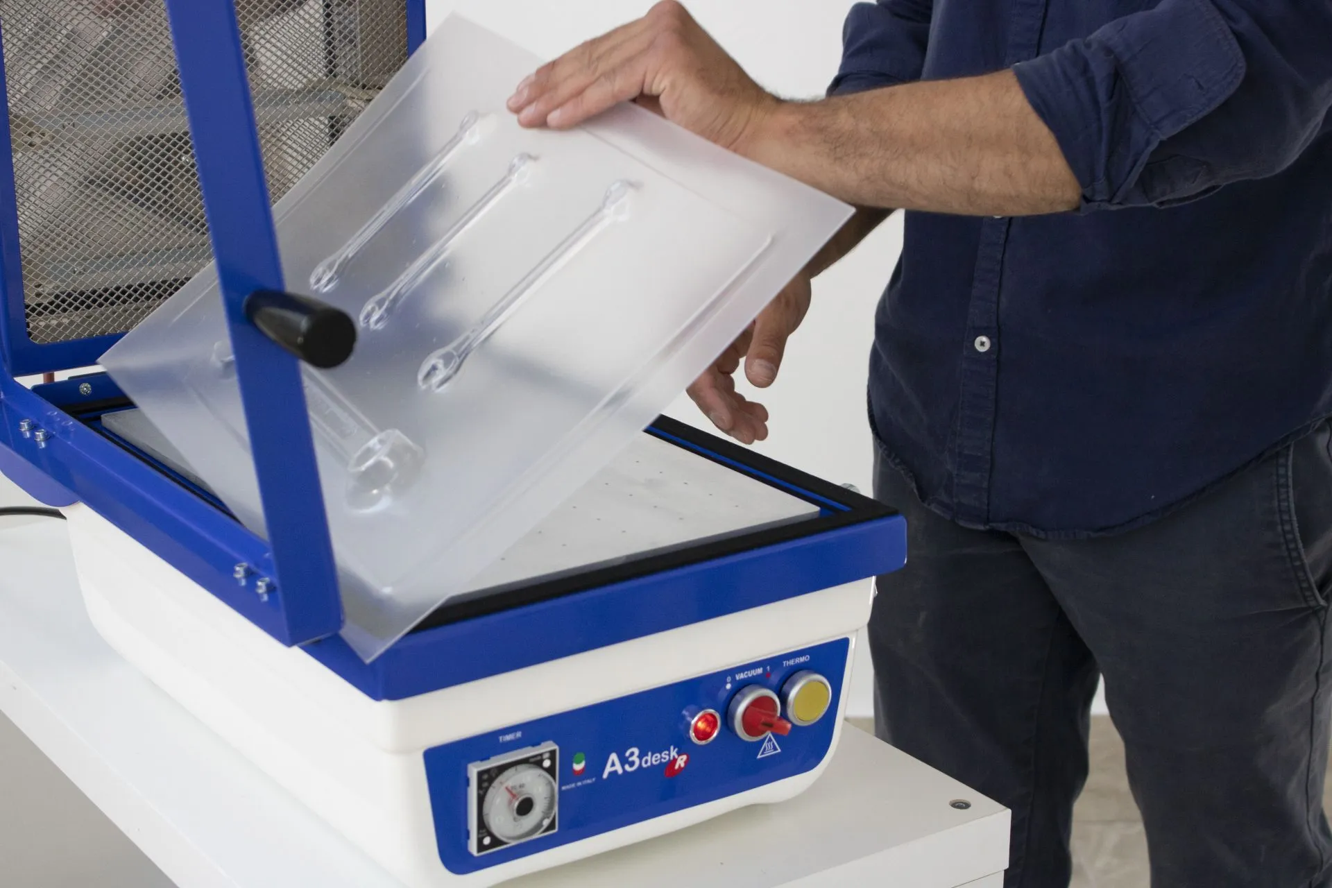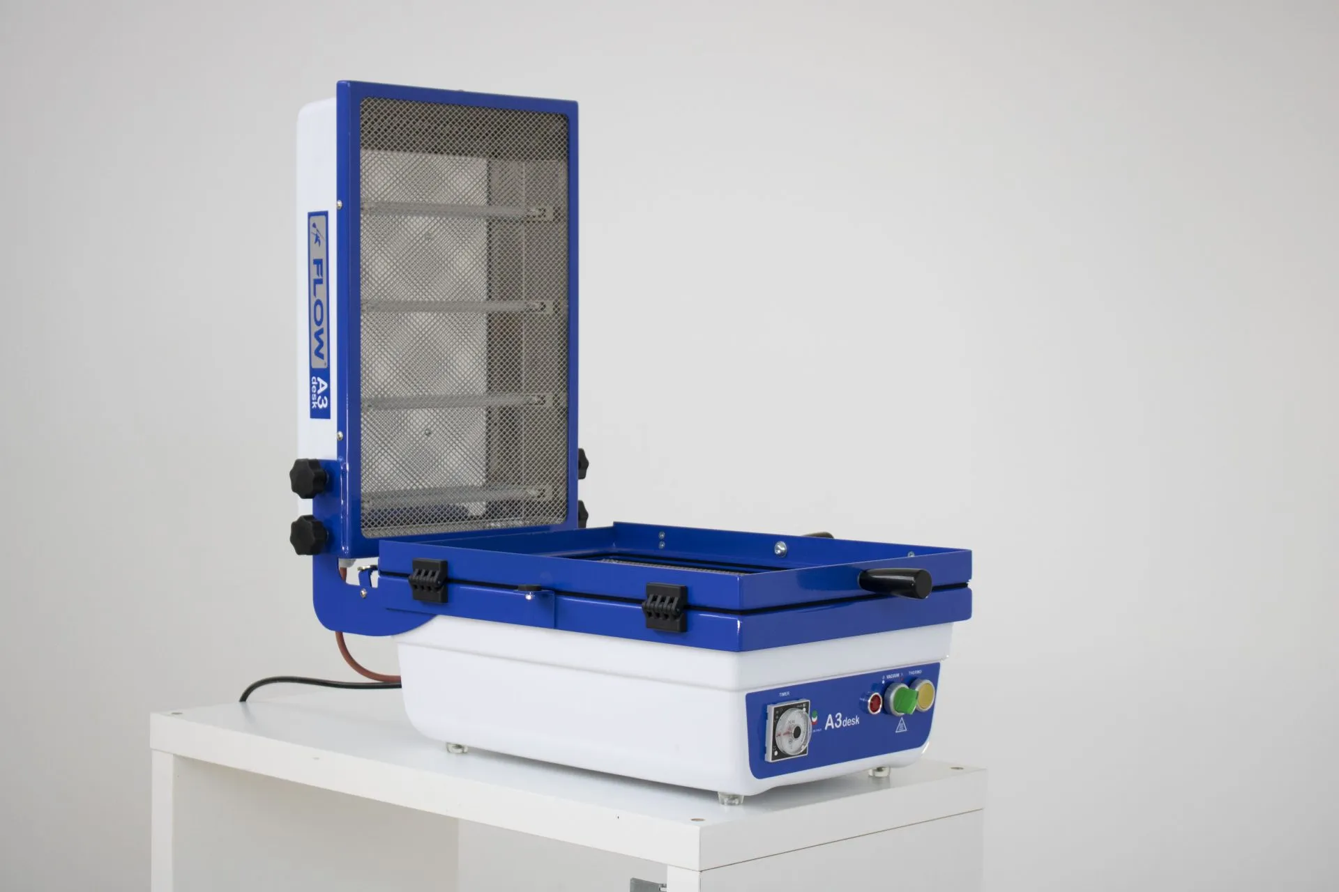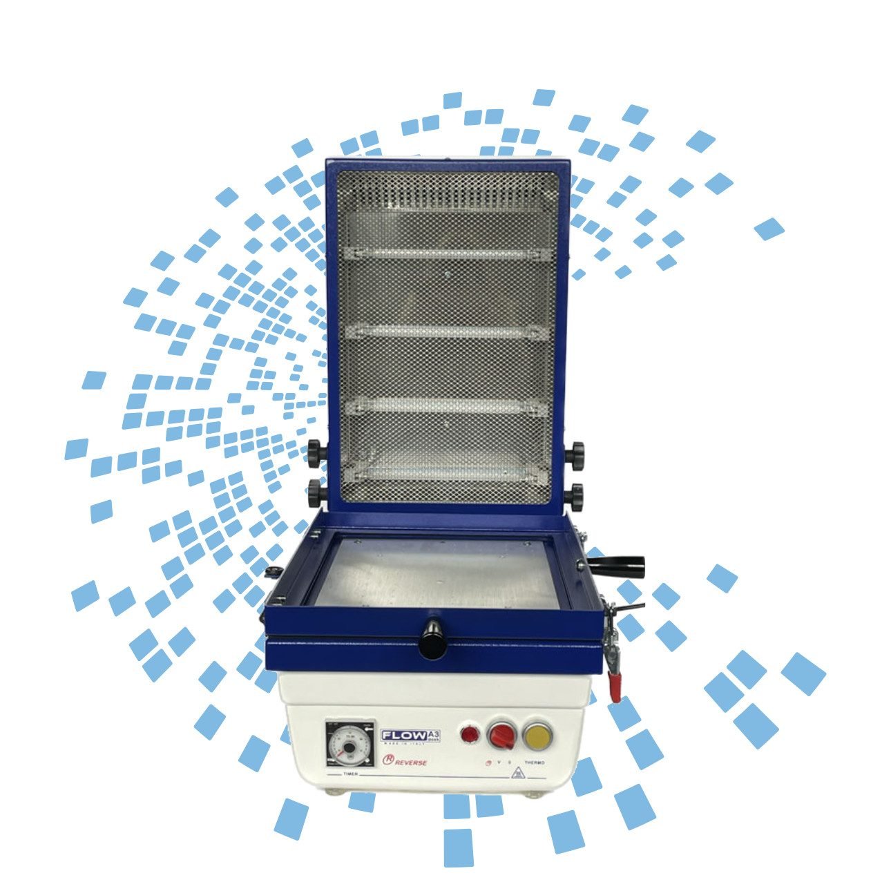The FLOW A3 Desk is a professional thermoforming machine designed to process A3-sized plastic sheets with thicknesses ranging from 0.5 to 4 mm. It is the perfect solution for pastry chefs, chocolatiers, and creative professionals who want to go beyond standard molds and produce custom, unique designs.