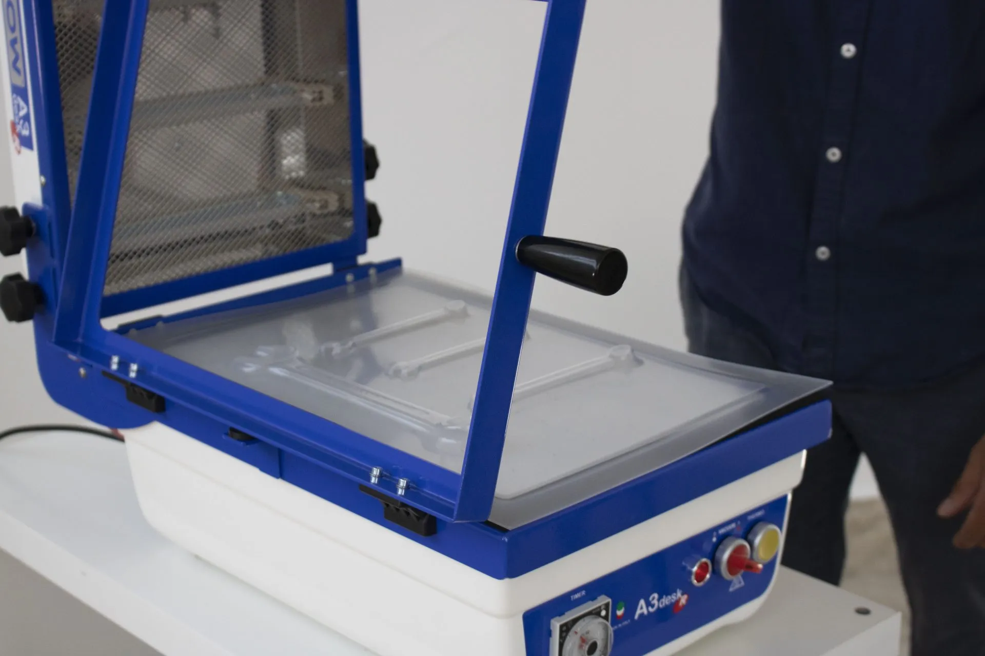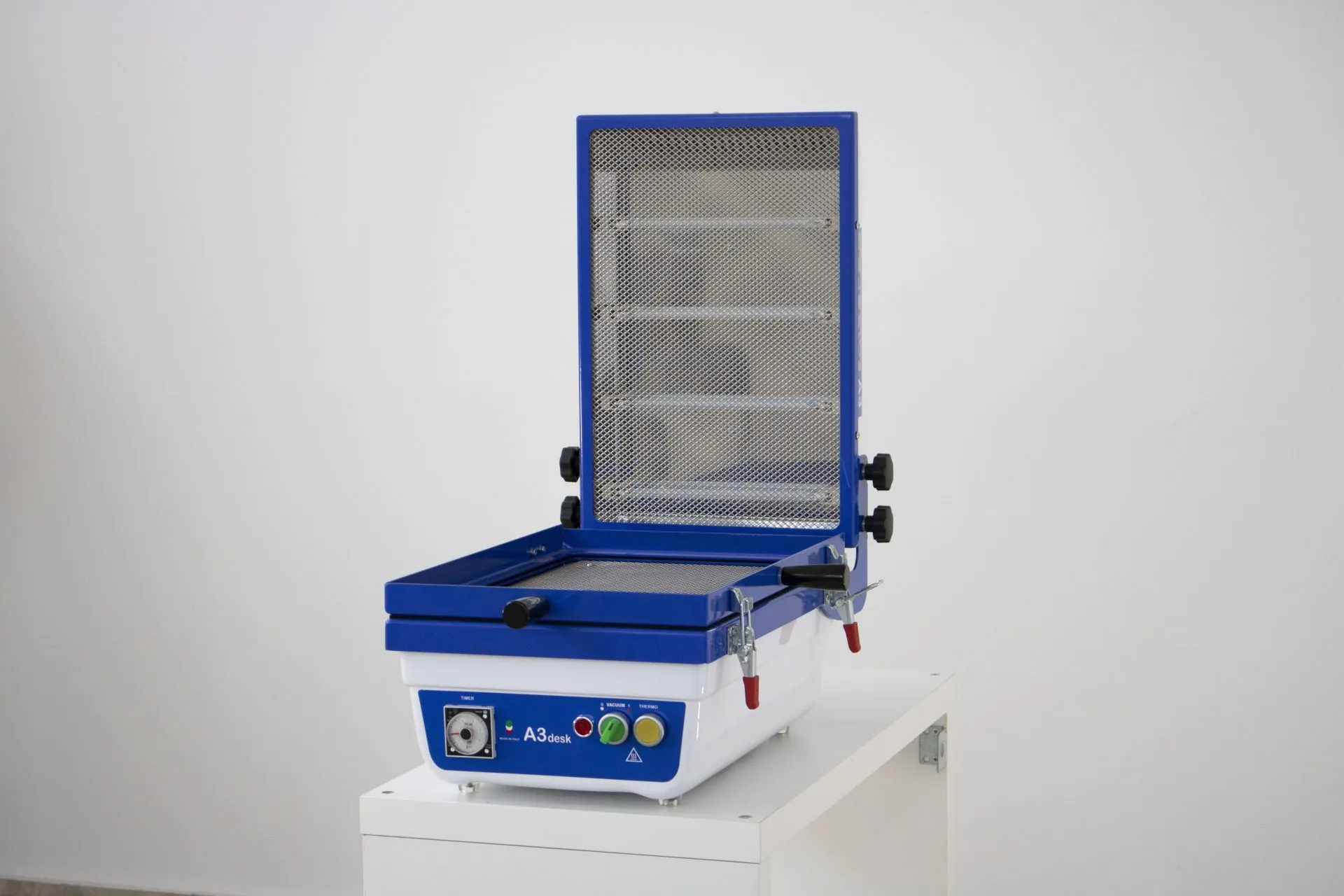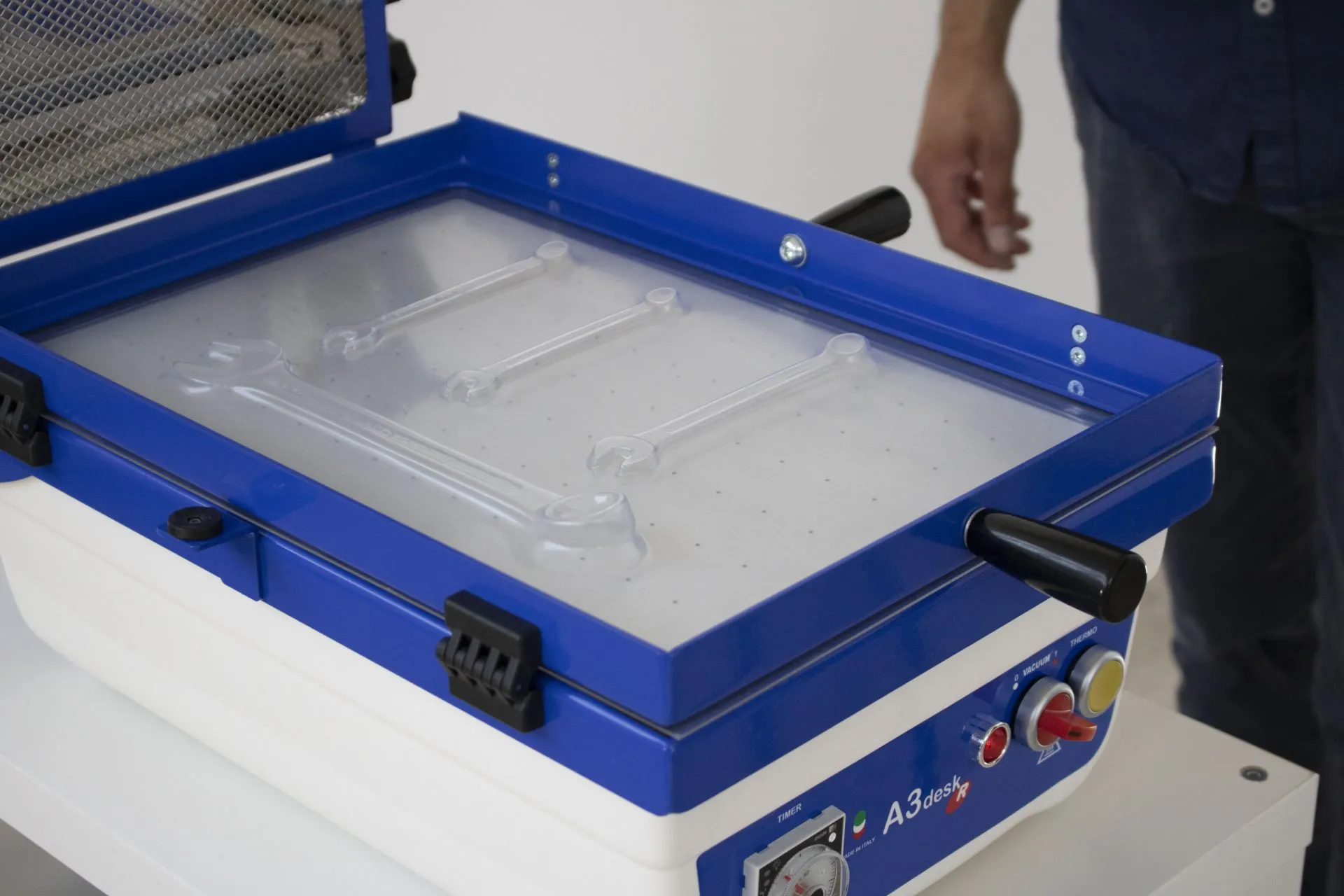 The FLOW A3 Desk is a professional thermoforming machine designed to process A3-sized plastic sheets with thicknesses ranging from 0.5 to 4 mm. It is the perfect solution for pastry chefs, chocolatiers, and creative professionals who want to go beyond standard molds and produce custom, unique designs.