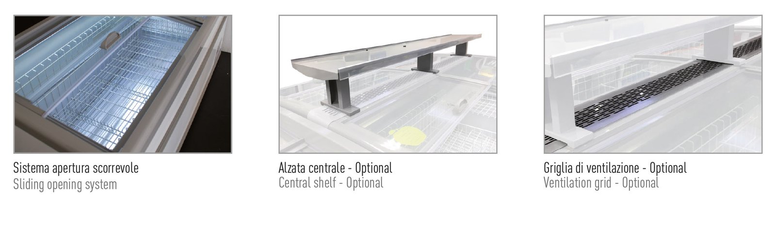 This static jumbo island freezer is equipped with sliding flat glass lids, ensuring excellent product visibility and convenient customer access. Its anticorrosion-treated steel body and embossed aluminum interior provide durability and hygiene, while the automatic hot-gas defrost system guarantees ease of maintenance.