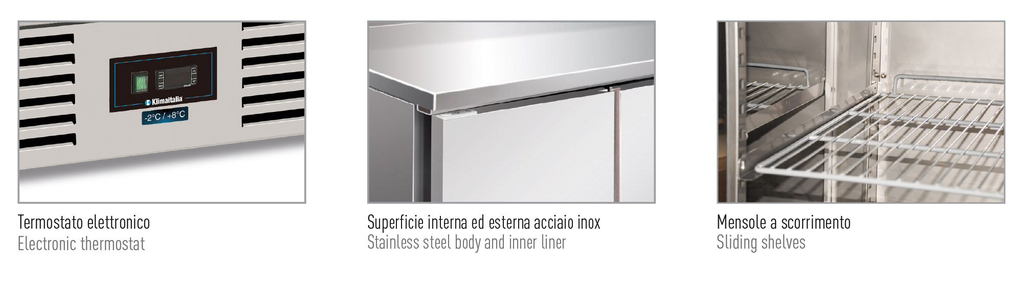 Equipped with an electronic thermostat, the saladettes maintain a precise temperature range between +2 °C and +8 °C, making them ideal for preserving fresh ingredients. Their automatic defrost system ensures hassle-free operation, while the sliding shelves provide flexible storage solutions.