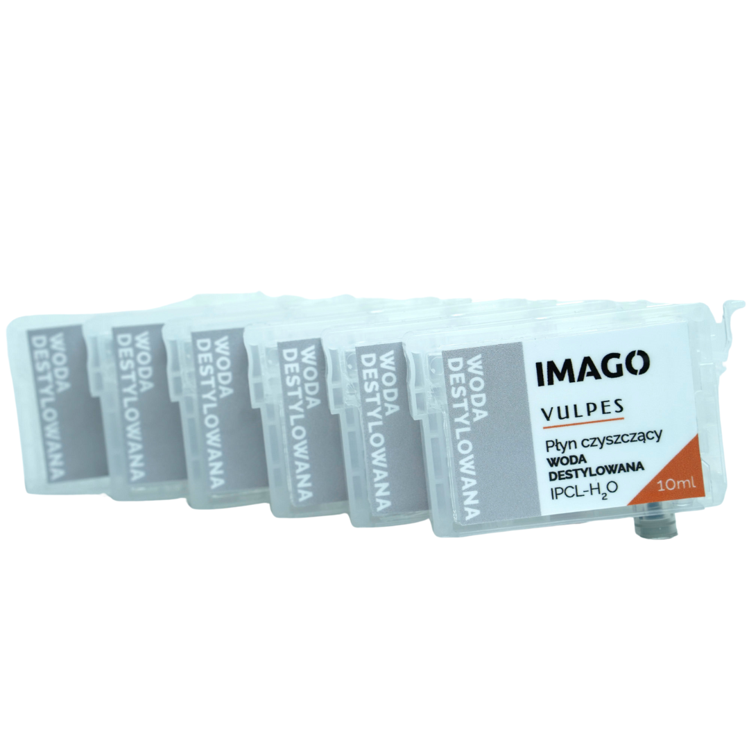 Set of cleaning fluid cartridges for the IMAGO plotter, 6 pcs., designed specifically for IMAGO plotters. The cartridges guarantee optimal performance of your plotter. The fluid has been designed to gently treat the mechanisms of the confectionery plotter, eliminating all contaminants without the risk of damage.