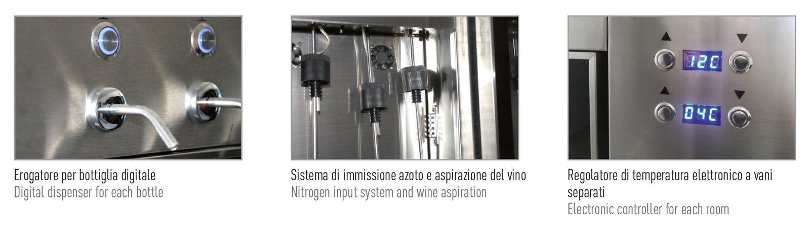 Equipped with a digital dispenser for each bottle, it ensures accurate pouring with an adjustable dosage (default 75 ml). The integrated nitrogen preservation system (E941) prevents oxidation, maintaining the wine’s original quality for up to 3–4 weeks after opening.