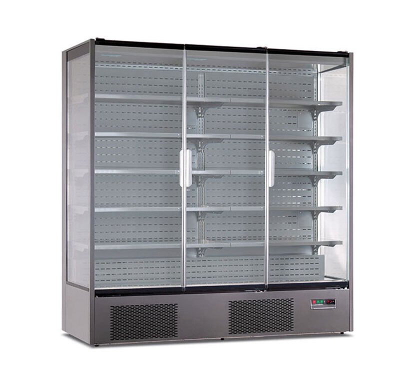 The VISION 200 is a ventilated multideck cooler with three glass sides and three frameless hinged doors, designed for supermarkets, minimarkets, and convenience stores that require high-capacity refrigeration with positive temperature operation.