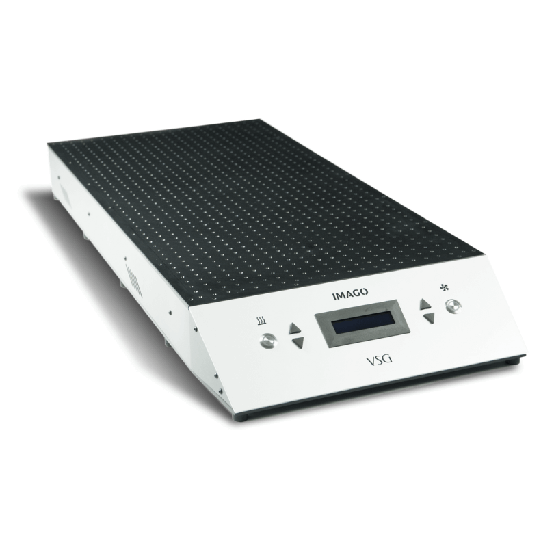 A simple solution supporting IMAGO digital printers. The design of the device is aesthetic and user-friendly, and its operation and maintenance are extremely economical. When not in use, the VSG switches off automatically, which contributes to lower operating costs. Individual functions are controlled with just three buttons, making the device easy to operate. Suction table for UV LED and Nanosolvent printers The VSG module automatically smoothes the substrate during printing and allows thin materials to be supported, increasing the precision and repeatability of UV LED prints on paper, foil, metal sheets, plywood, and fabrics. At the same time, it prevents deformation of details under the influence of heat from the UV LED lamp, thus facilitating printing on acrylic, PVC, and other plastics. High precision printing on anodized aluminum The temperature function when printing on sheets of anodized aluminum increases the achievable color saturation and print resolution by evaporating excess ink. At the same time, the vacuum table increases print precision by stabilizing the sheet metal on the work table. Printing capabilities on malleable chocolate In the case of VSG food printers, it increases the print quality on chocolate and allows it to be malleably formed after printing. Vacuum suction, on the other hand, allows printing on sugar paper and transfer foil.